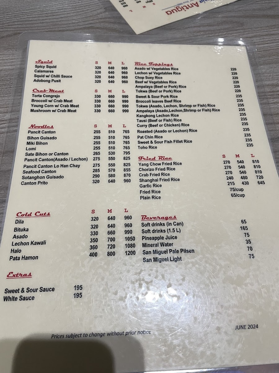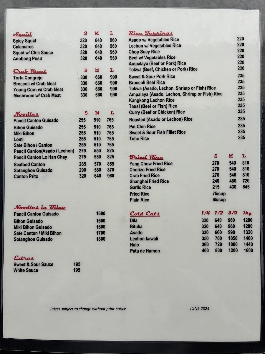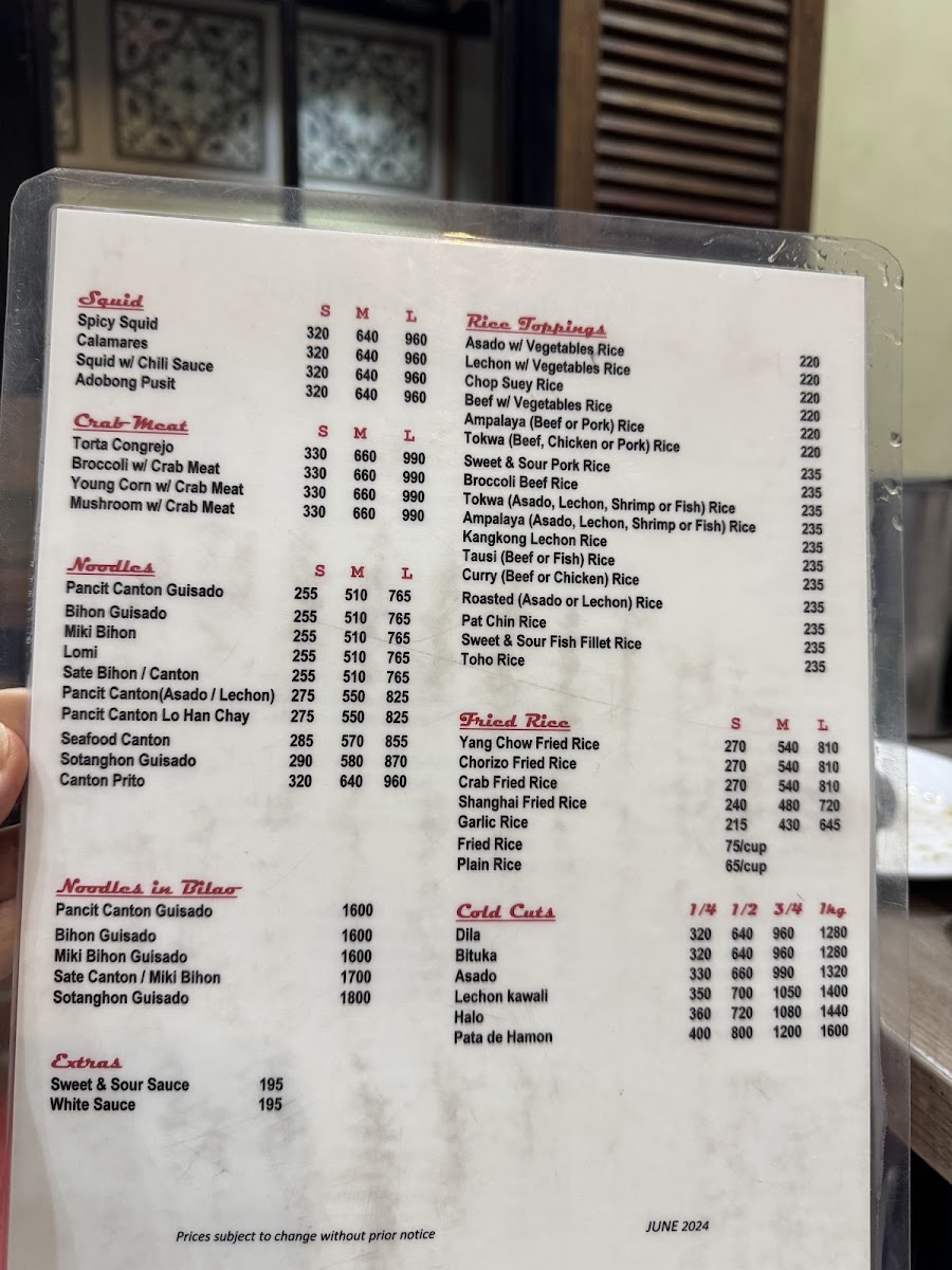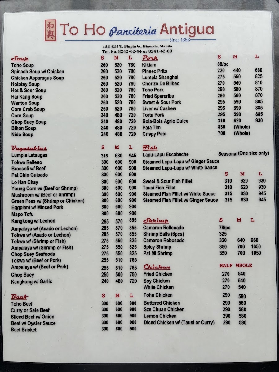 Introducing the menu at To Ho Panciteria Antigua, a historic gem located on Tomas Pinpin Street in Binondo, Manila. Renowned as the oldest panciteria in the city, it proudly offers a menu steeped in tradition and flavor.